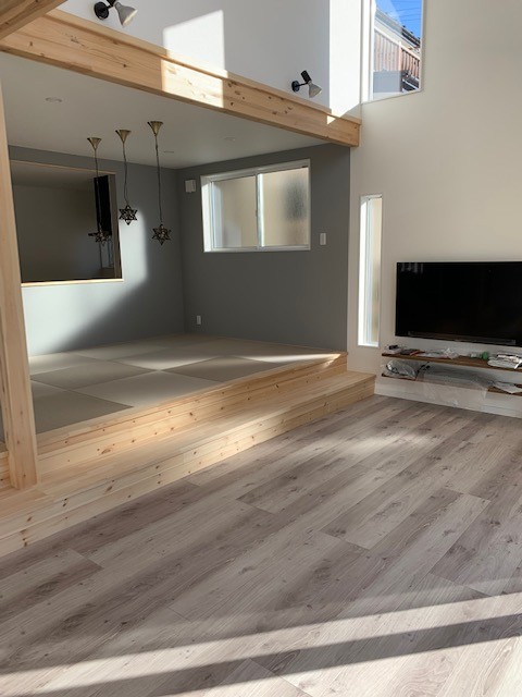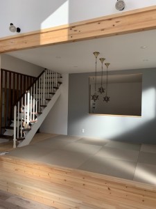 新築物件 || 住宅k.M邸 新築工事 ⑥完成 2022年1月21日 M邸 完成しました。 外観・玄関 ↑ 玄関 入ると色々入れられるシューズクロークがあります。 ↓ 廊下・階段 広いリビングは 段上がって 畳敷で小さい子供が居る為 畳に座りゆっくり食事が出来る様になっています。 開放感のあるリビングの窓 対面キッチン ファミリークローゼット トイレ 洗面・浴室 二階は階段を上って二部屋・向かいにもう一部屋の三部屋で収納もたっぷり 若い夫婦と子供二人の明るい家が出来ました。